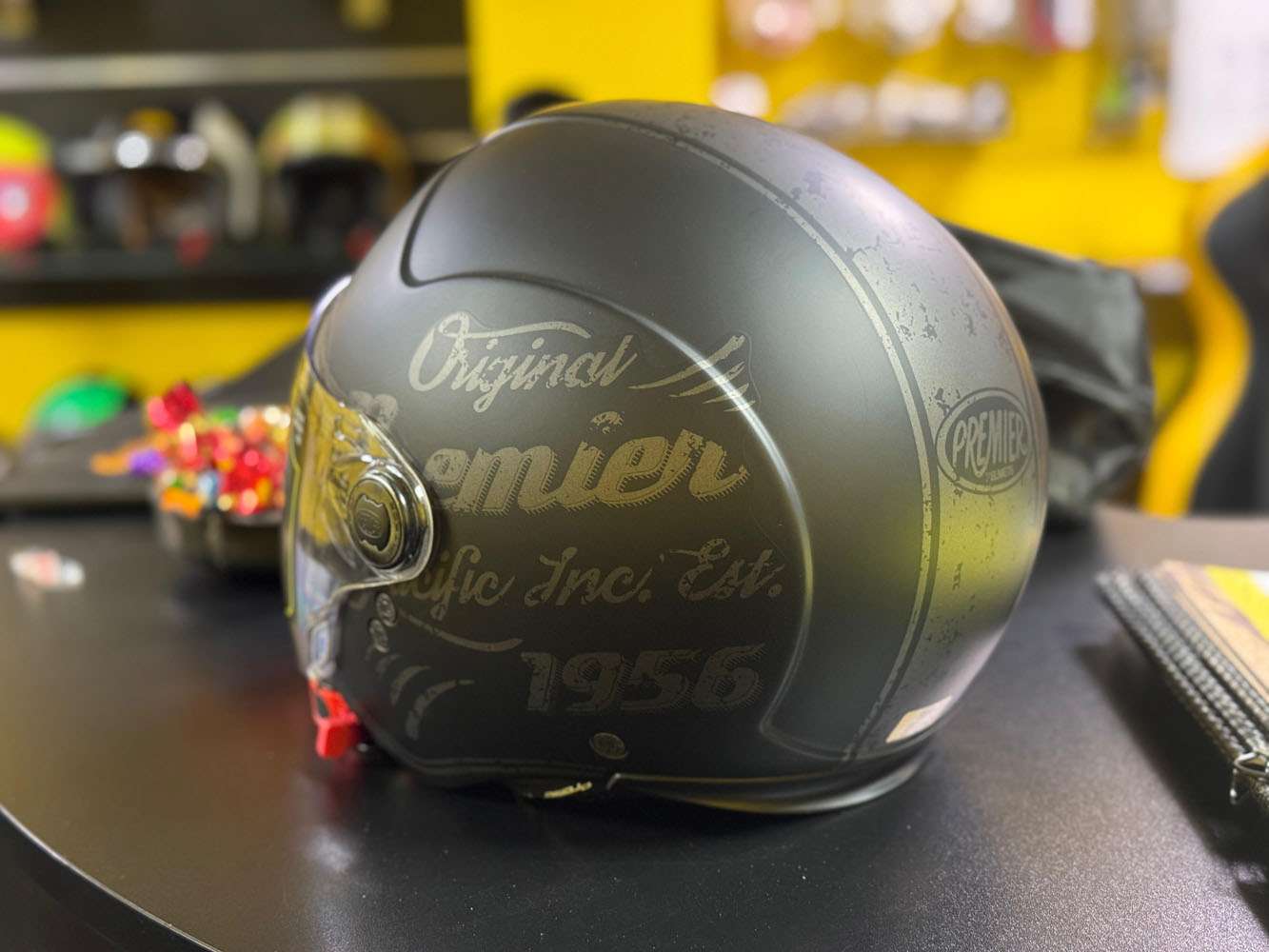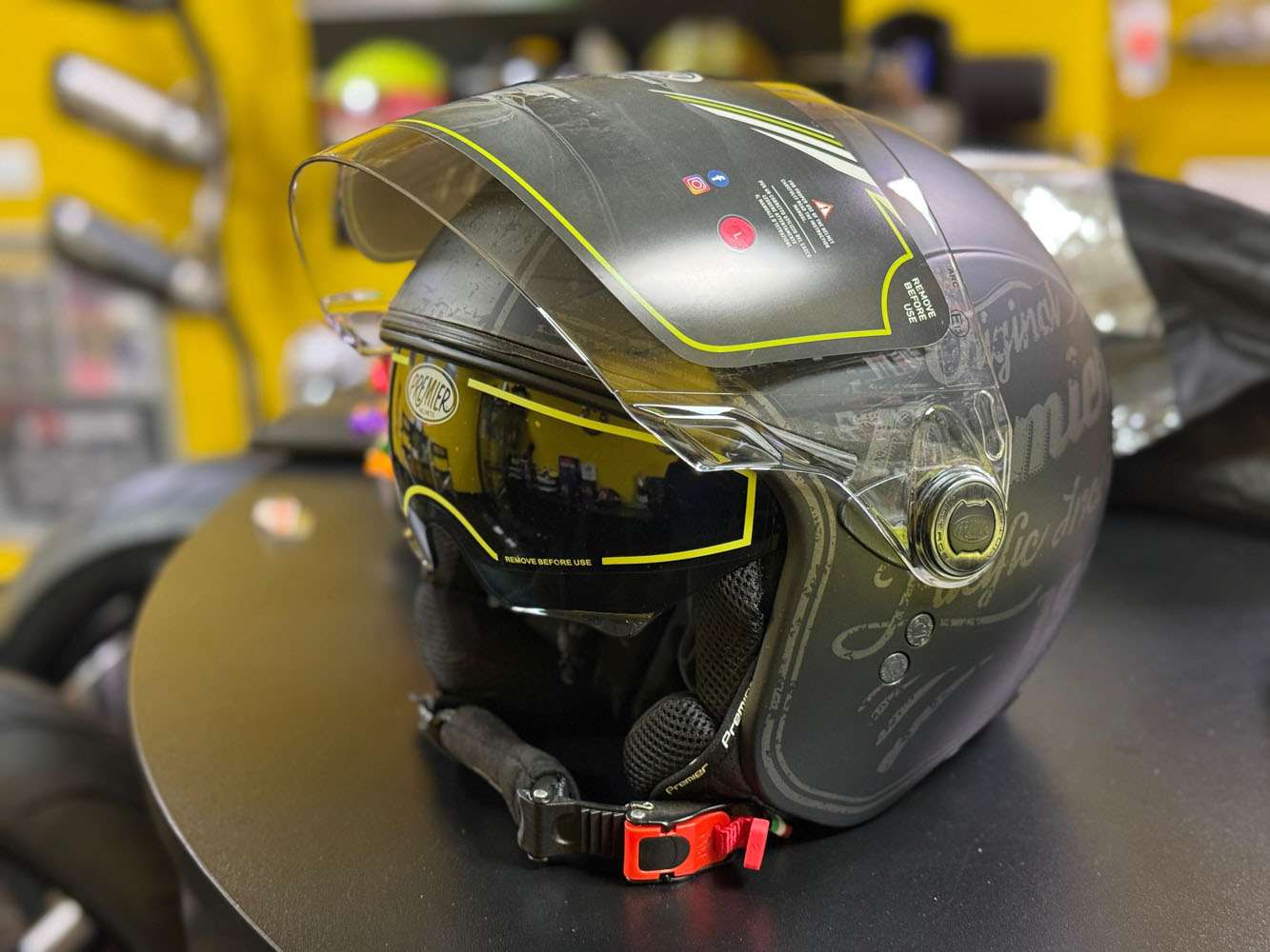 Casco tipo jet Premier Rocker Visor OR 19 BM con pantalla, muy ligero y fabricado en resina termoplástica elaborado mediante la tecnología avanzada de polímeros. Destaca por su amplia pantalla clara y el visor solar interior. Los acolchados interiores son totalmente desmontables y lavables. Cierre micrométrico.